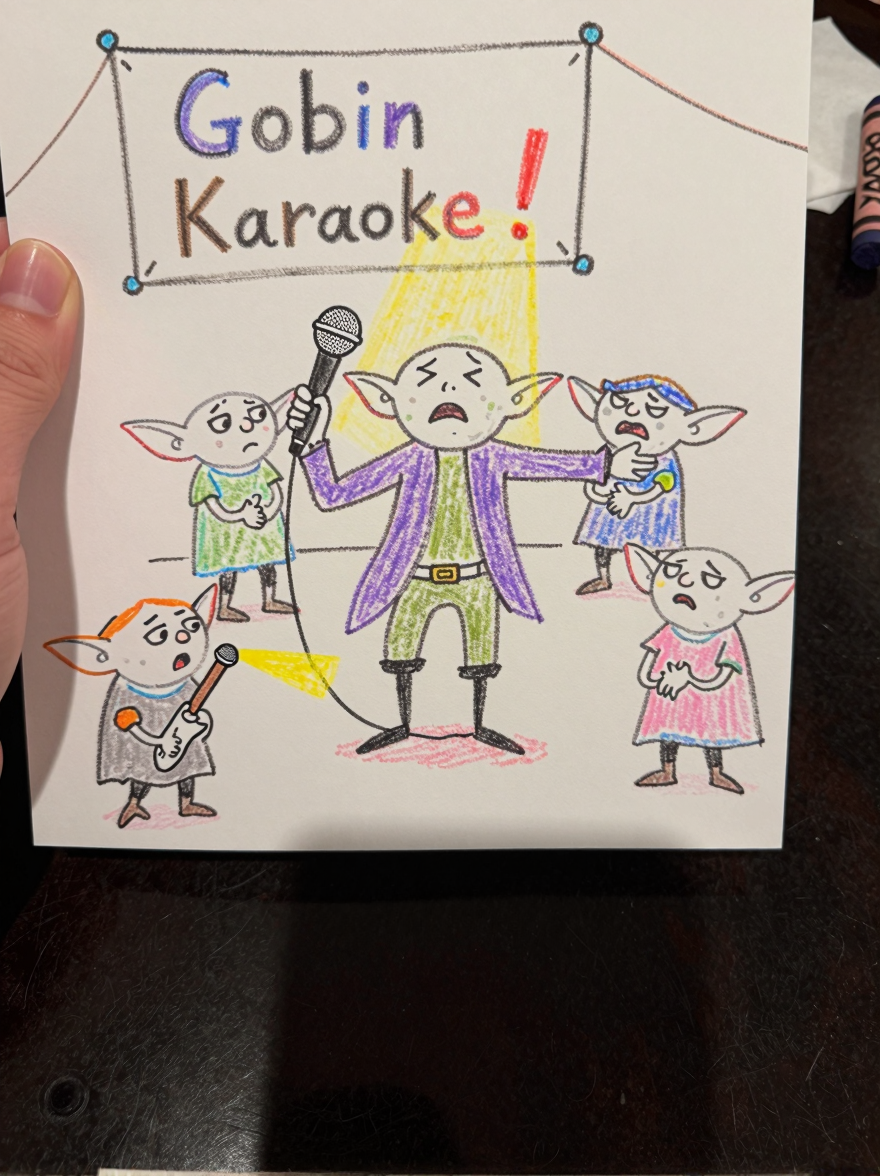 Discover Karaoke in this enchanting page from Olive the Demon Hunter's A-Z adventure. Olive the Demon Hunter blushes under the spotlight, mic in hand, as goblins sing loudly—her crayon world is weirdly wonderful. Perfect for young readers ages 3-8.