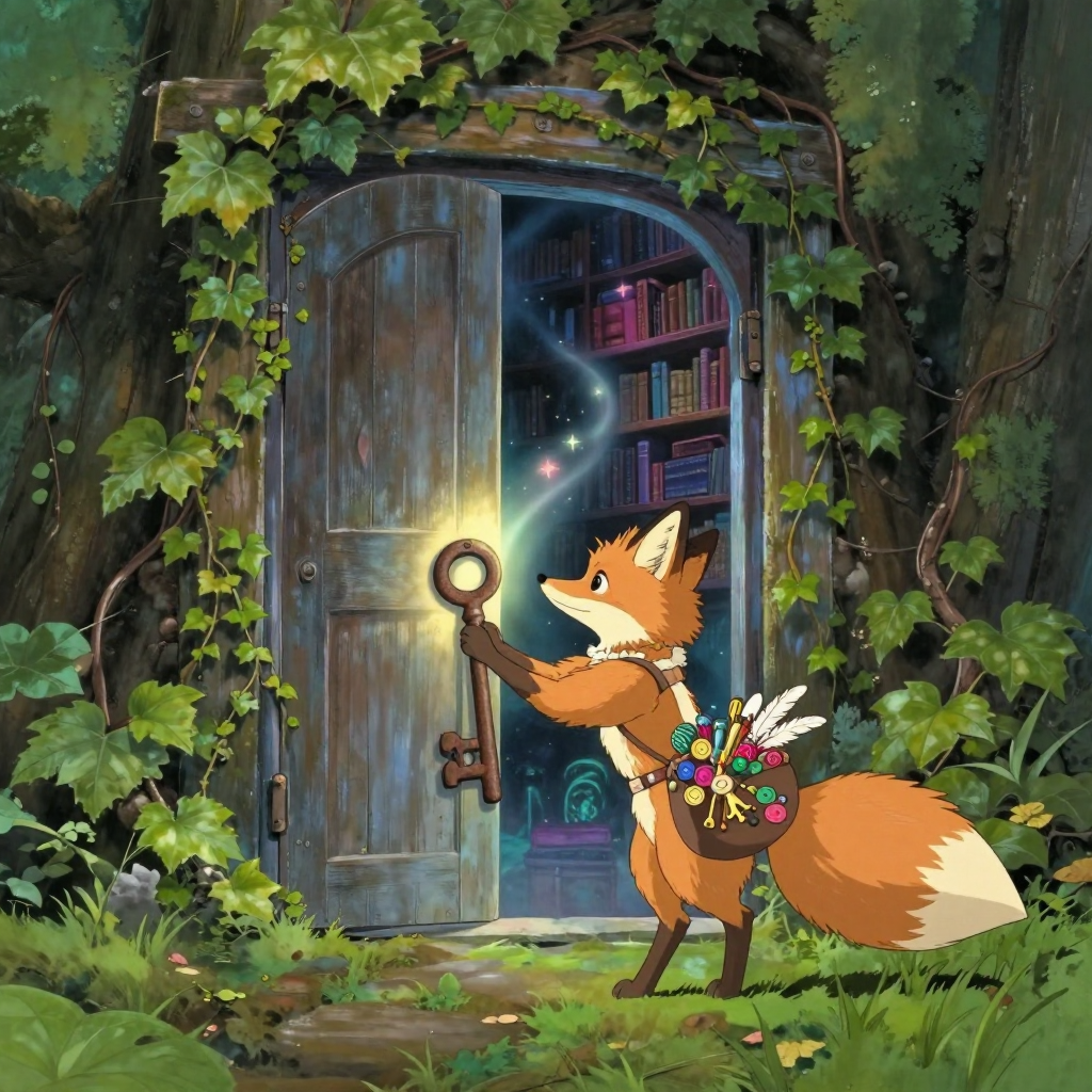 Discover Key in this enchanting page from Nori's A-Z adventure. Nori turns the rusty key—and the hilldoor whispers open, spilling glowing dreams into the warm afternoon light. Perfect for young readers ages 3-8.