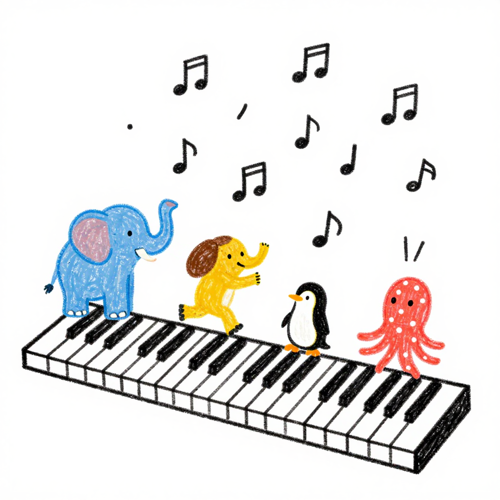 Discover Keyboard in this enchanting page from Boronica's A-Z adventure. Boronica stomps the sky-piano—elephants, penguins, and polka-dot octopuses bounce out in colorful scribbles! Perfect for young readers ages 3-8.