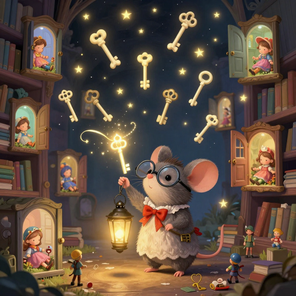 Discover Keys in this enchanting page from Mira's A-Z adventure. Mira’s glowing key spins with starlit bones, unlocking dreamy doors full of sleeping dolls and toy soldiers. Perfect for young readers ages 3-8.