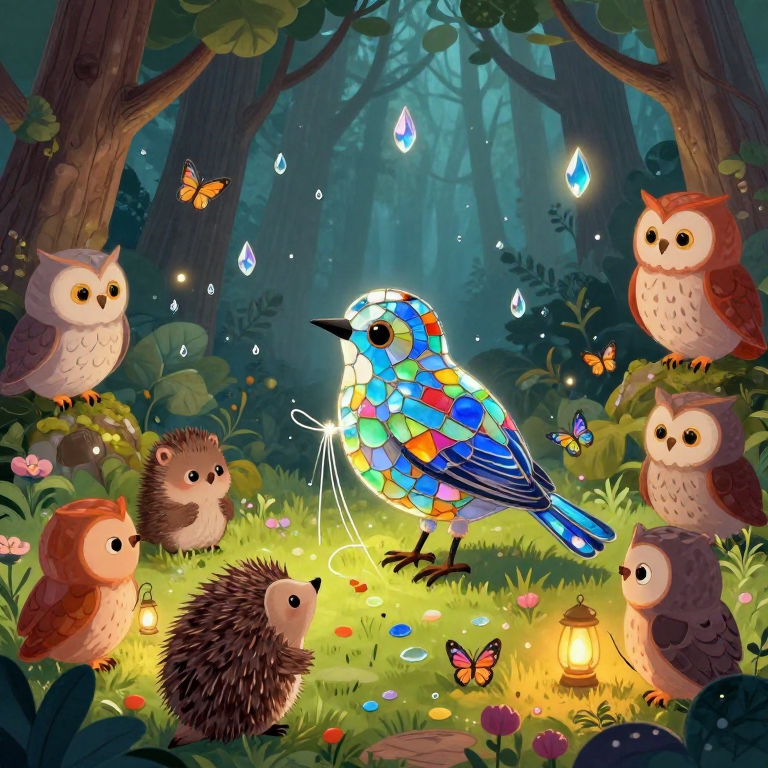 Discover Kindness in this enchanting page from AI's A-Z adventure. Gentle AI mends a glass-feathered starling as forest friends glow with lanterns, turning dew into sparkles. Perfect for young readers ages 3-8.