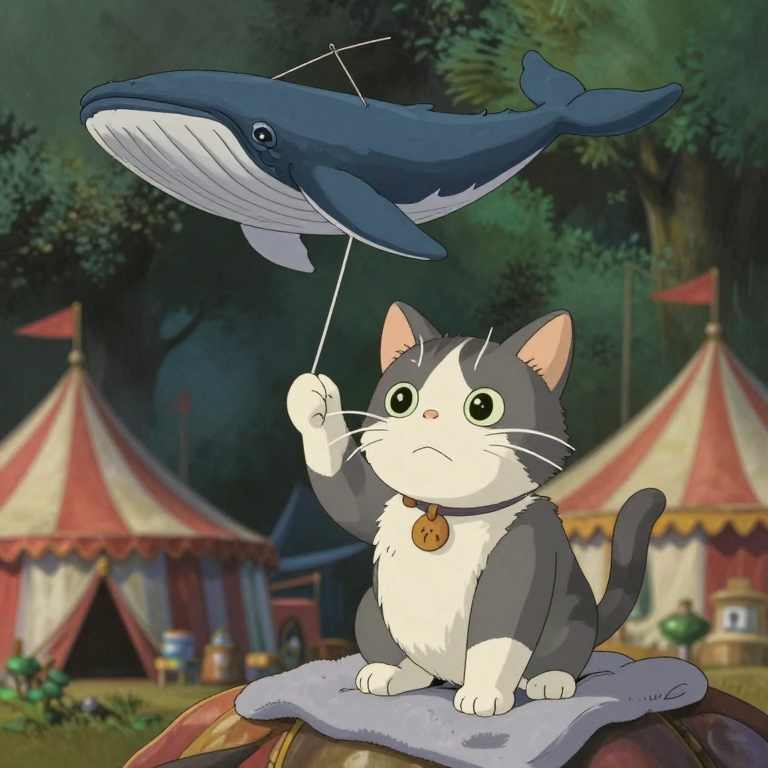 Discover Kite in this enchanting page from 🎪 Miji's A-Z adventure. Miji, the brave munchkin cat, holds tight to a magical whale kite that dances with the wind above the circus. Perfect for young readers ages 3-8.