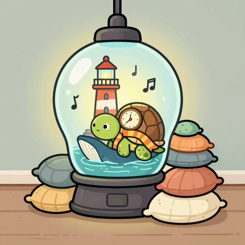 Discover Lighthouse Lullaby in this enchanting page from Tilly's A-Z adventure. Tilly the turtle naps in the lighthouse, her scarf pooling like a wave as whales hum lullabies through the glass. Perfect for young readers ages 3-8.