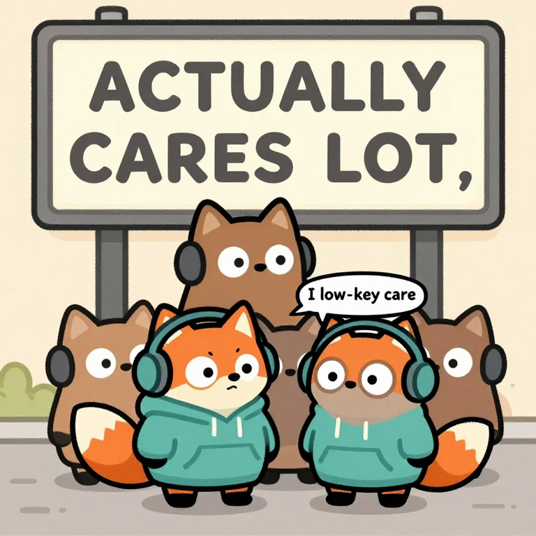 Discover Low-key in this enchanting page from Jax's A-Z adventure. Jax the fox in a big teal hoodie whispers “I low-key care” under a loud, flashing sign. Perfect for young readers ages 3-8.