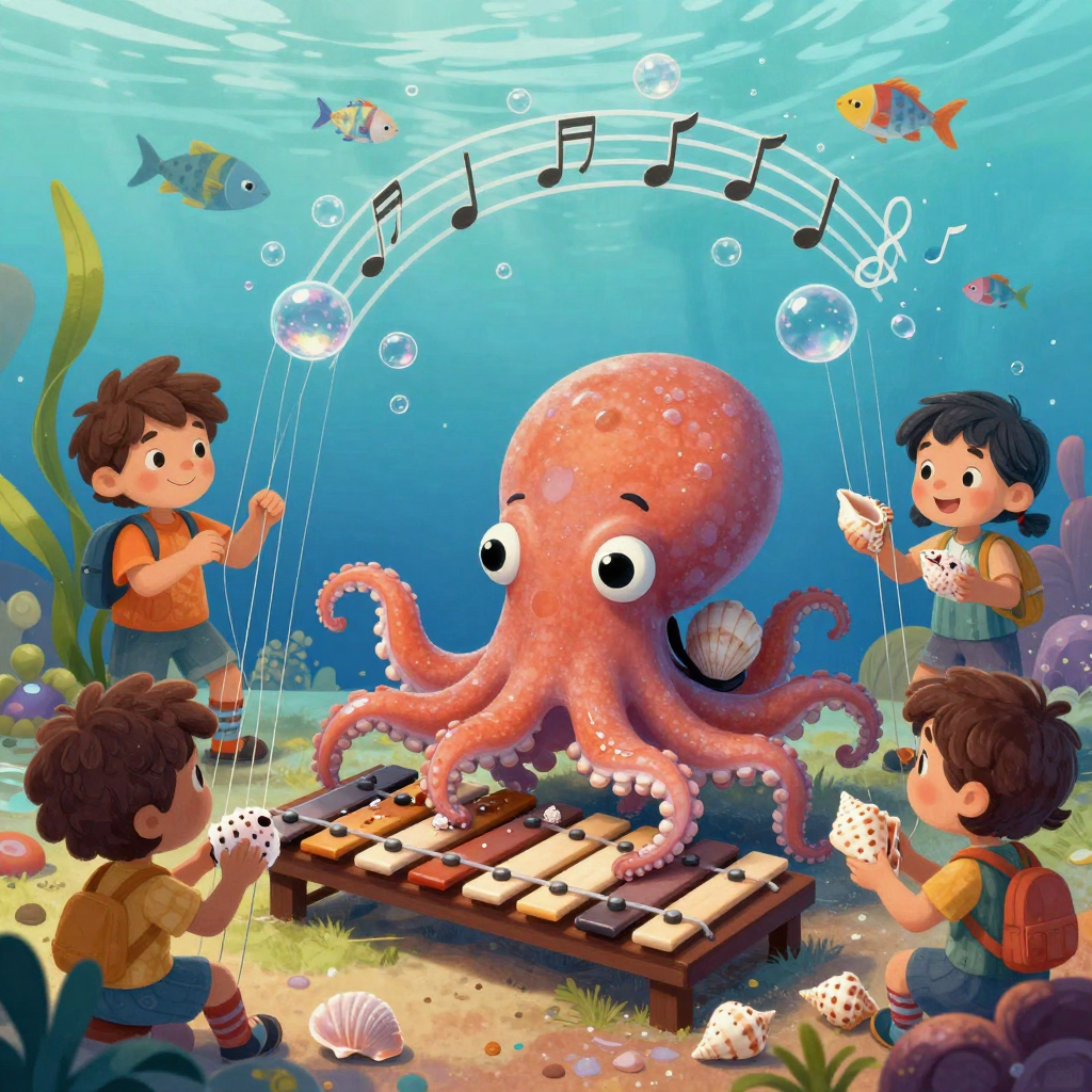 Discover Melody in this enchanting page from Bubbles's A-Z adventure. Eight wiggly tentacles tap-shell xylophones as fish-bubbles hum a joyful, shimmering tune. Perfect for young readers ages 3-8.