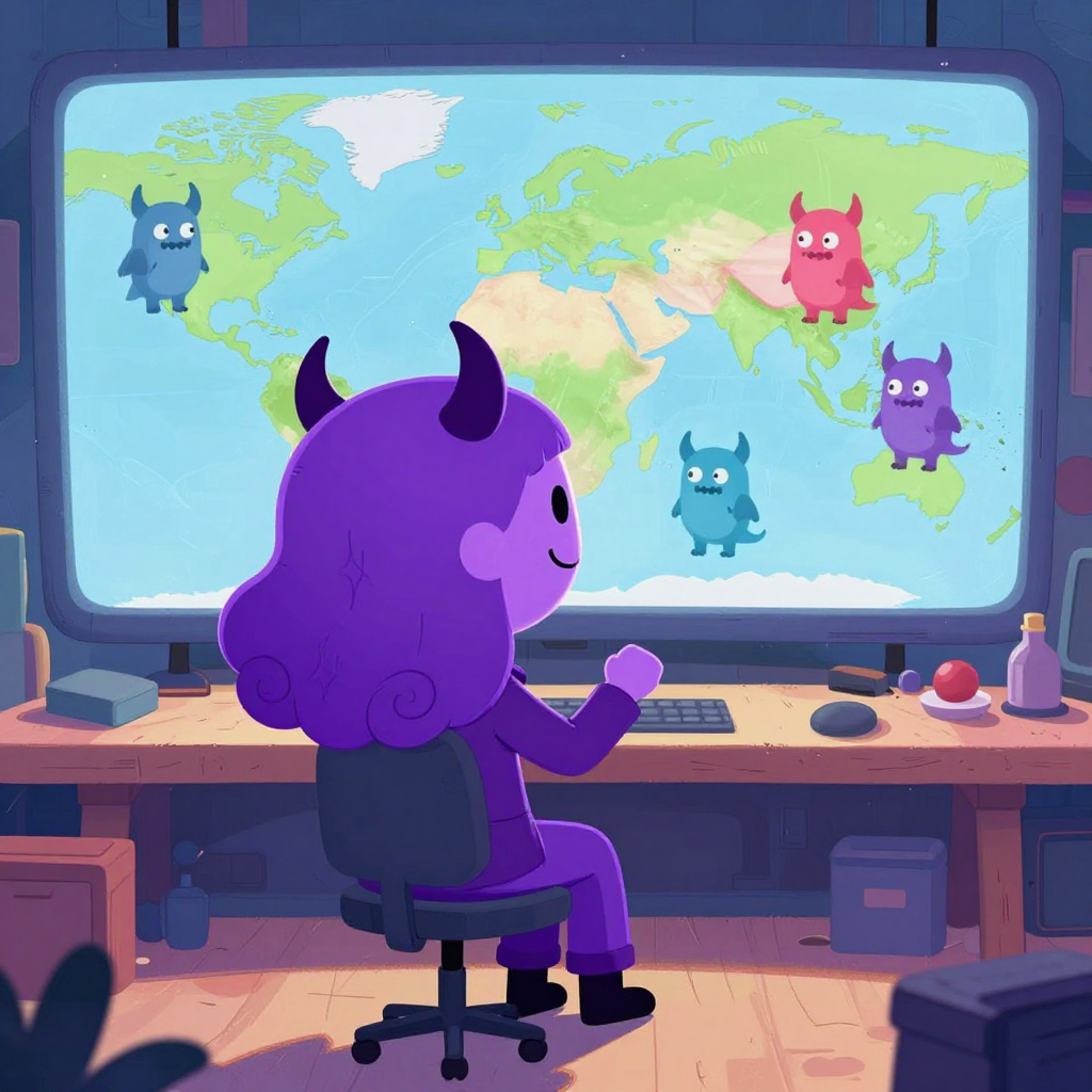 Discover Mission Control in this enchanting page from Olive the Demon Hunter's A-Z adventure. Olive watches tiny demons wink out on her screens, smiling with marker-drawn joy. Perfect for young readers ages 3-8.