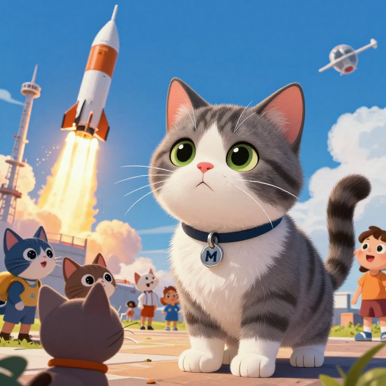 Discover Monument in this enchanting page from Miji's A-Z adventure. Miji, the tiny munchkin cat with starry green eyes, gazes in wonder as the rocket soars into the sky. Perfect for young readers ages 3-8.