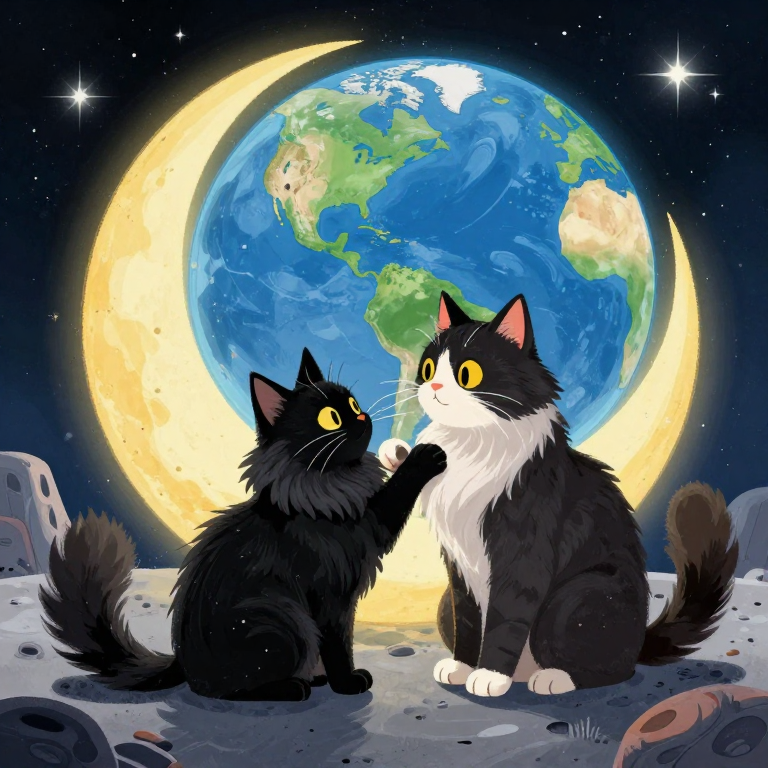 Discover Moon in this enchanting page from Fluffy's A-Z adventure. Fluffy the black Maine Coon meets a mooncat on the lunar surface, grooming each other under Earth's watching glow. Perfect for young readers ages 3-8.