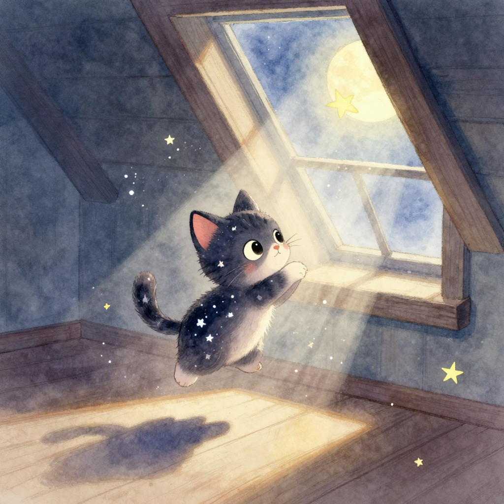 Discover Moonbeam in this enchanting page from Luna's A-Z adventure. Luna leaps into moonlight, star dust dancing as her paws float like whispers. Perfect for young readers ages 3-8.