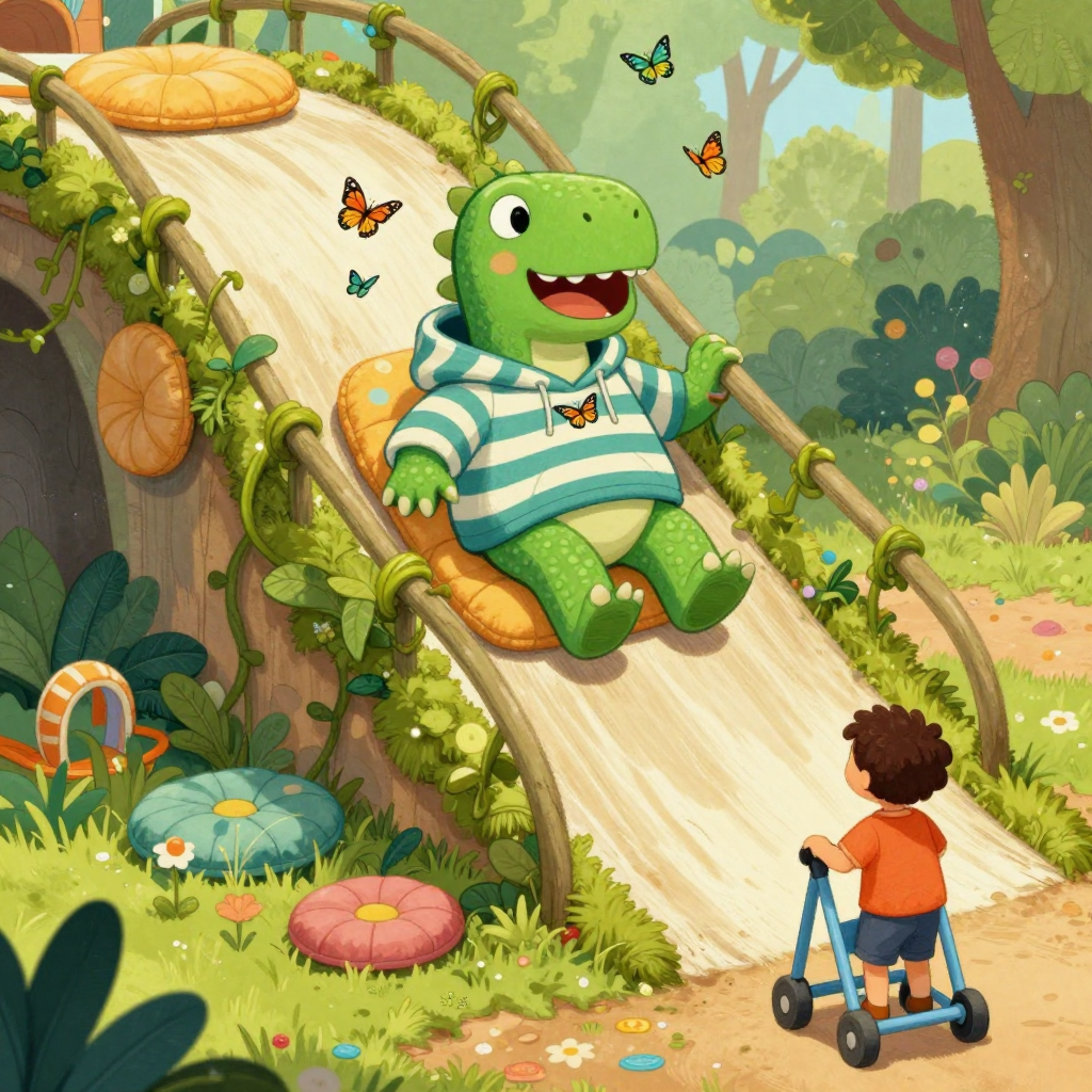 Discover Mossy ramps in this enchanting page from Pipkin's A-Z adventure. Pipkin whooshes down a mossy ramp, giggling as butterflies dance on their too-big hoodie. Perfect for young readers ages 3-8.