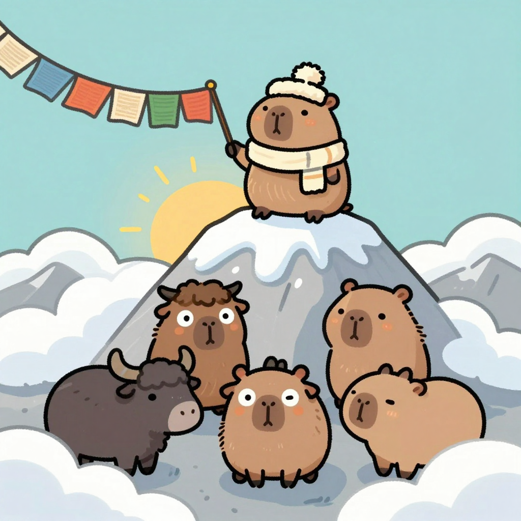 Discover Mountain in this enchanting page from Kappy's A-Z adventure. Kappy the capybara waves prayer flags at sunrise, wearing a cozy hat, as yaks bow below in quiet wonder. Perfect for young readers ages 3-8.
