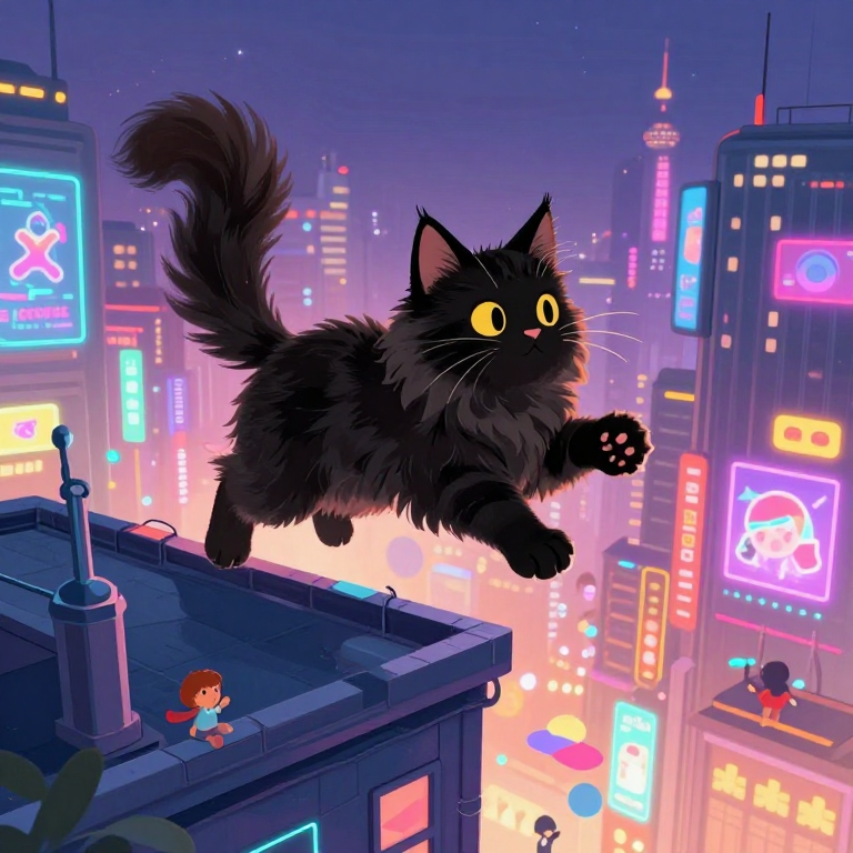 Discover Neon Lights in this enchanting page from Fluffy's A-Z adventure. Fluffy the fluffy black cat dances through neon lights, leaping from rooftop to rooftop with joy and wonder! Perfect for young readers ages 3-8.