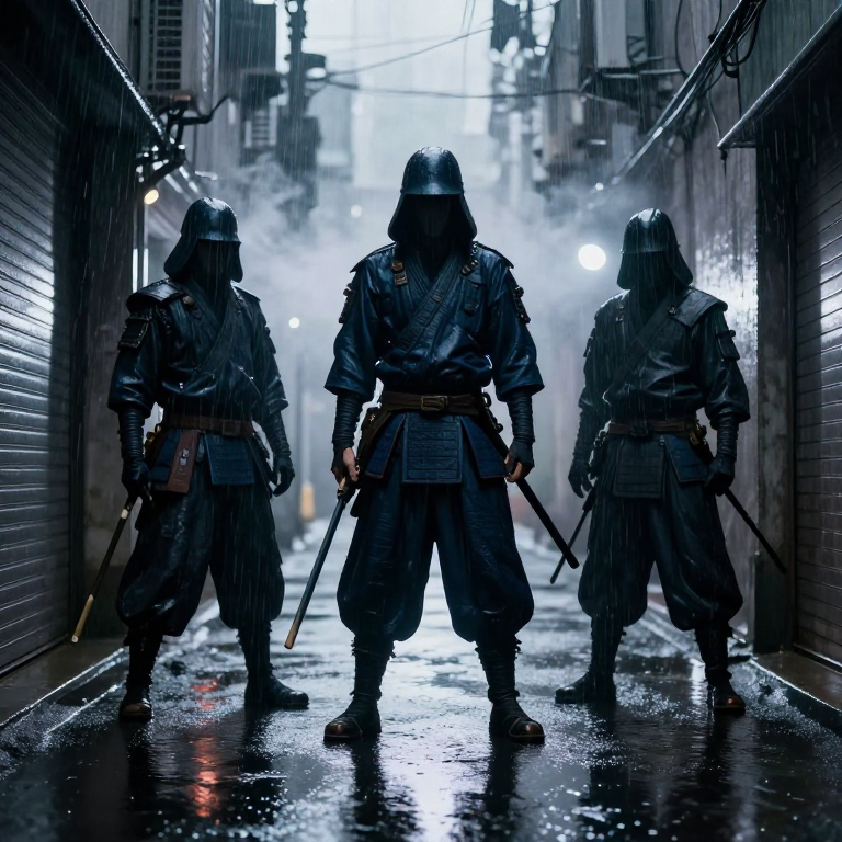 Discover neon samurai standing in this enchanting page from Pulse's A-Z adventure. Neon samurai stands tall in the rainy alley, shimmering like a glowing ghost. Perfect for young readers ages 3-8.