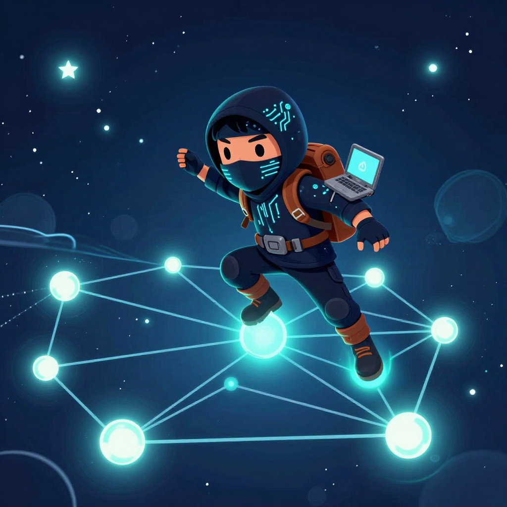 Discover Network Nodes in this enchanting page from Mark the Ninja Acrobat Engineer's A-Z adventure. Mark the ninja coder leaps between glowing web-nodes, stitching stars with light trails! Perfect for young readers ages 3-8.