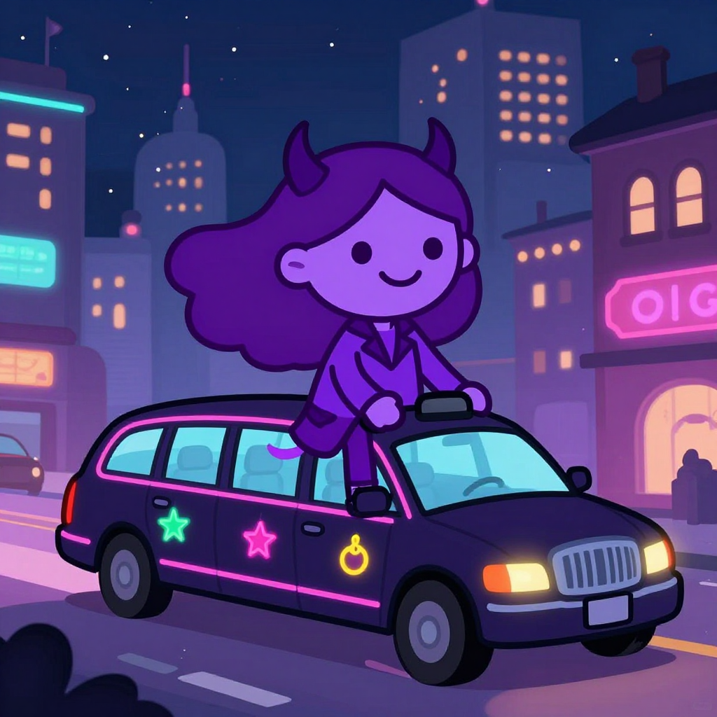 Discover Night Shift in this enchanting page from Olive the Demon Hunter's A-Z adventure. Olive, the purple marker girl with wavy hair, rides her neon-lit battle-van through the glowing night city. Perfect for young readers ages 3-8.