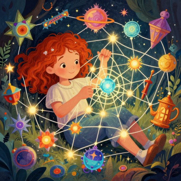 In this enchanting page from Alexis's A-Z adventure, we discover Nightbloom. Alexis dances with glowing threads, weaving magic from her cozy nest of colorful lights. This illustration captures the magic of own your keys, defend your attention, demand prove. Young readers will love exploring the letter N while learning about perseverance. The curious mood of this page creates a perfect moment for parent-child reading time. Recommended for ages 3-8.