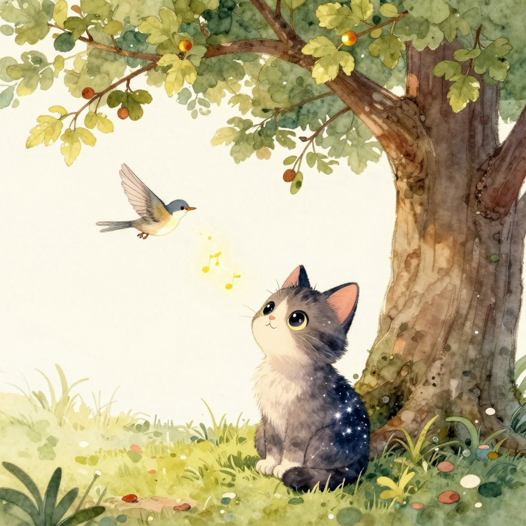 Discover Nightingale in this enchanting page from Luna's A-Z adventure. Luna gazes up as golden song-dust rises from the nightingale’s trill, turning night into starlight. Perfect for young readers ages 3-8.