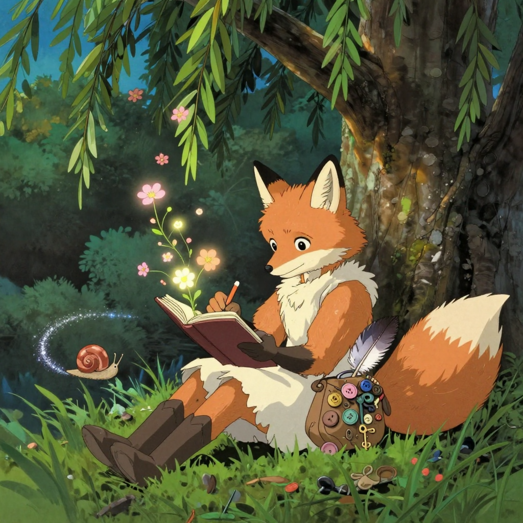 Discover Notebook in this enchanting page from Nori's A-Z adventure. Nori writes glowing words under the willow, and lost things bloom like fireflies in the dusk. Perfect for young readers ages 3-8.