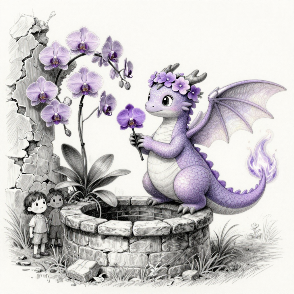 Discover Orchid in this enchanting page from Ember's A-Z adventure. Ember gently cradles a violet orchid—its petals flutter to life, blooming into wings along the old well. Perfect for young readers ages 3-8.