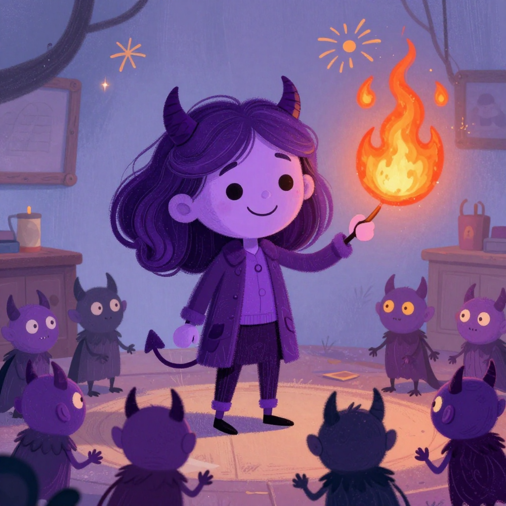 Discover Outreach in this enchanting page from Olive the Demon Hunter's A-Z adventure. Olive the purple marker girl teaches shy demons to turn fire into sparkling fireworks with kindness. Perfect for young readers ages 3-8.