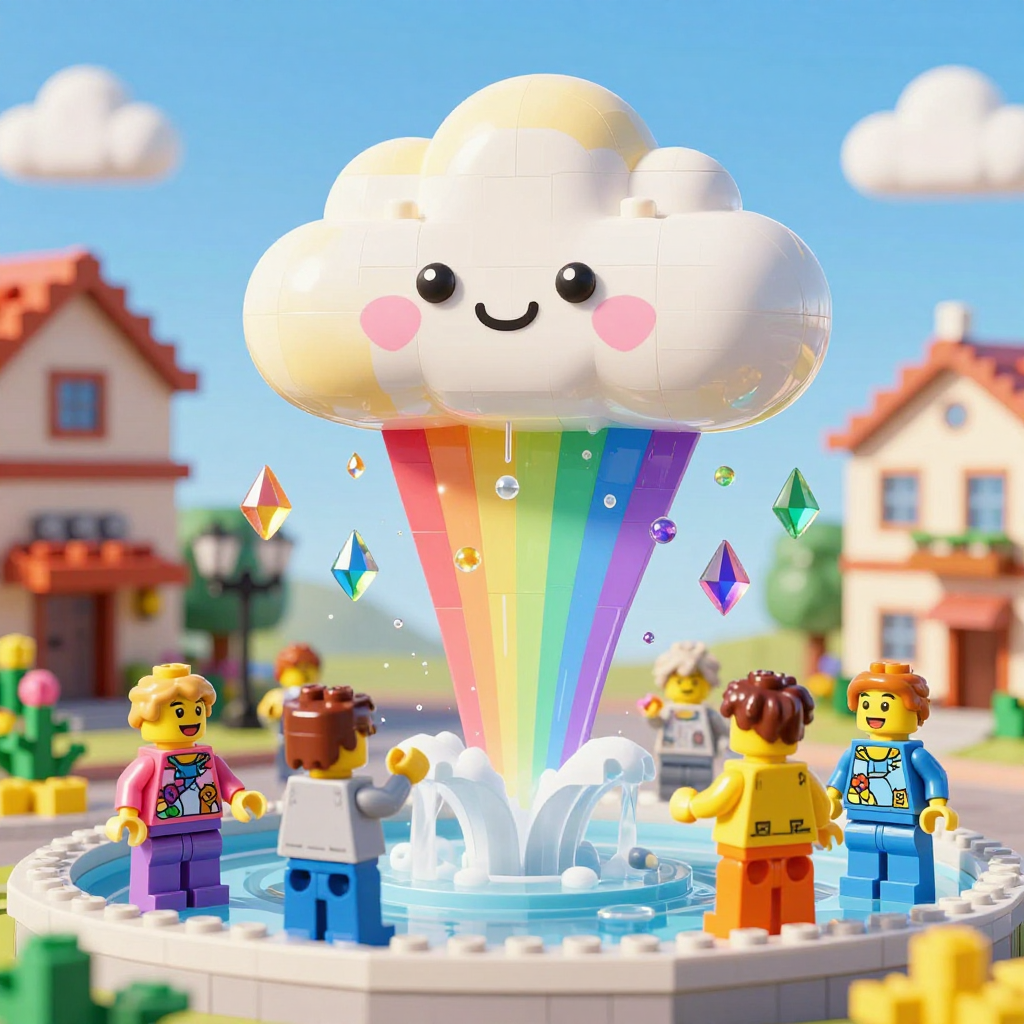 Discover Overflowing in this enchanting page from Sunny's A-Z adventure. Sunny the cloud bursts with rainbow mist as kids dance under sparkling water drops in a joyful LEGO splash! Perfect for young readers ages 3-8.