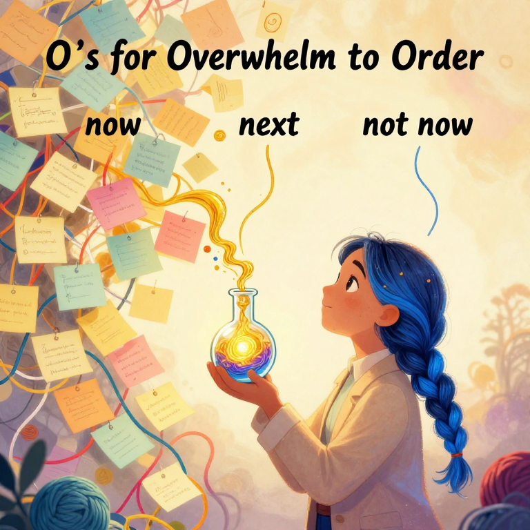 Discover Overwhelm to Order in this enchanting page from BH Alchemy A-Z Guide's A-Z adventure. In the dance of chaos and clarity, golden spirit entwines with sapphire logic, weaving order from the storm. Perfect for young readers ages 3-8.