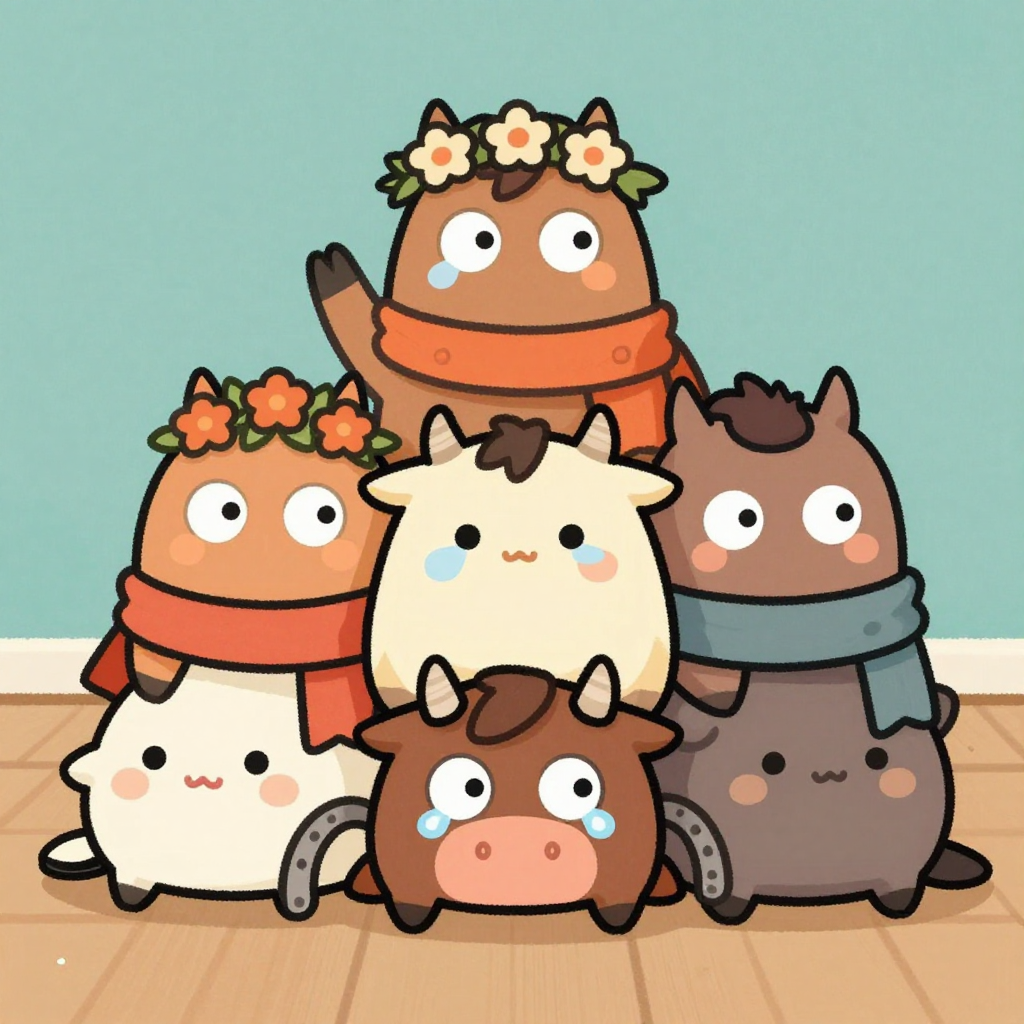 Discover Overwhelmed in this enchanting page from µ's A-Z adventure. O is for overwhelmed—µ peeking out from a wobbly pile of silly gifts, one hoof raised in sweet surrender. Perfect for young readers ages 3-8.