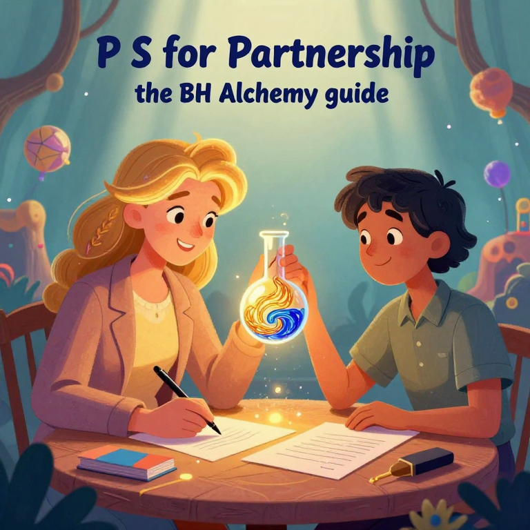Discover Partnership in this enchanting page from BH Alchemy A-Z Guide's A-Z adventure. In the dance of gold and blue, two souls intertwine, forging dreams with ink that shimmers. Perfect for young readers ages 3-8.