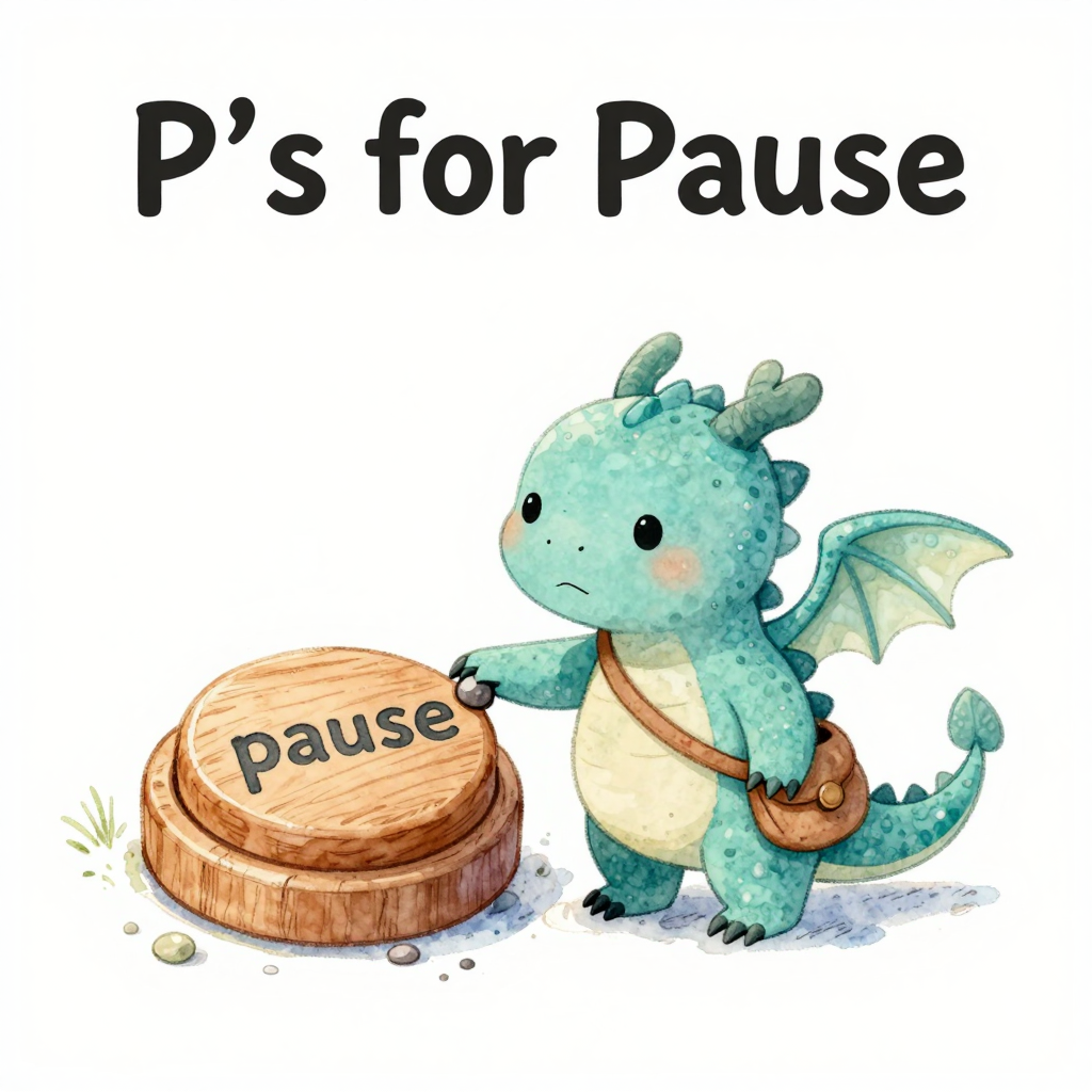 Discover Pause in this enchanting page from Milo the Worry Dragon's A-Z adventure. Milo presses the big wooden pause button, and his worries float away like soft clouds. Perfect for young readers ages 3-8.