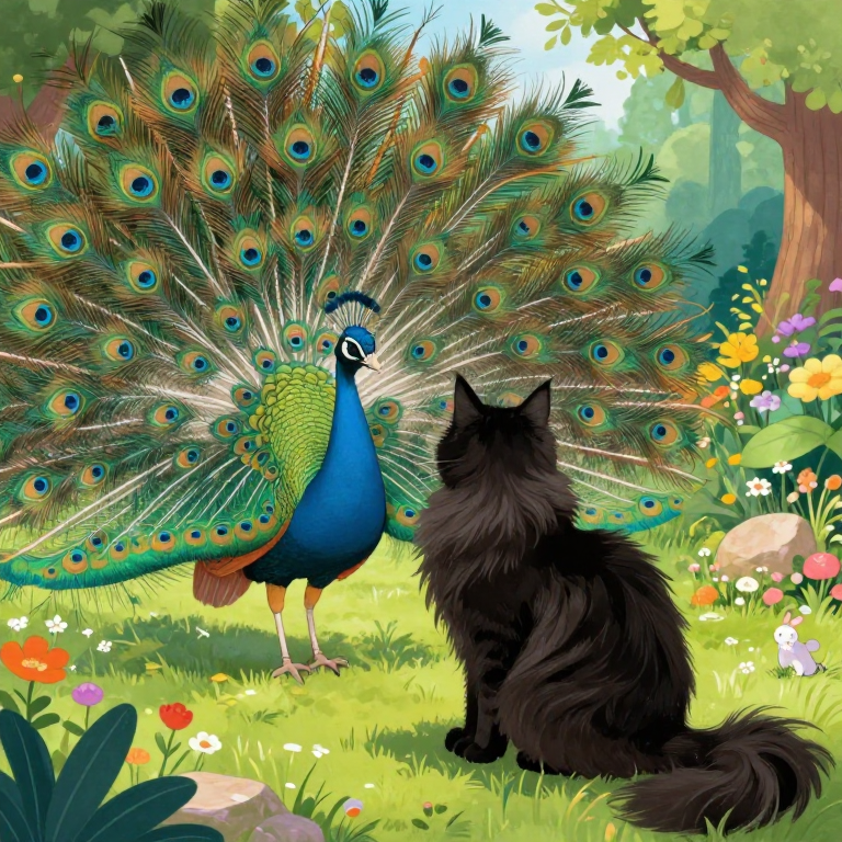 Discover Peacock in this enchanting page from Fluffy's A-Z adventure. Fluffy the fluffy cat gazes in awe at the peacock's dazzling tail, like a rainbow in an enchanted garden. Perfect for young readers ages 3-8.