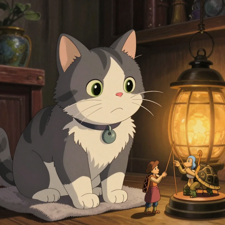 Discover Performance in this enchanting page from 🎪 Miji's A-Z adventure. Miji, the curious kitty, watches with wide eyes as a wise old tortoise puppet master weaves a magical tale. Perfect for young readers ages 3-8.