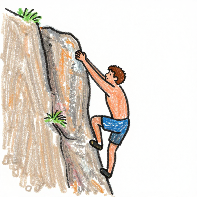 Discover Perseverance in this enchanting page from Ined de Sade's A-Z adventure. Ined ascends the cliff, a dance of straining muscles and vibrant crayon hues against raw rock. Perfect for young readers ages 3-8.