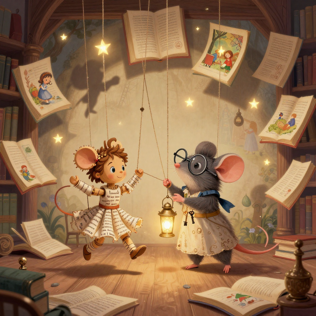 Discover Puppet in this enchanting page from Mira's A-Z adventure. Mira tugs twine-and-starlight strings, making the broken doll dance on floating book pages, whispering old rhymes to life. Perfect for young readers ages 3-8.