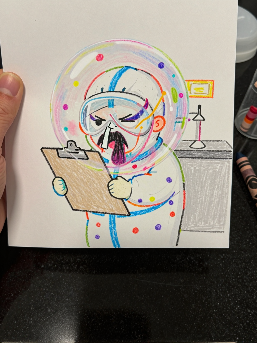 Discover Quarantine in this enchanting page from Olive the Demon Hunter's A-Z adventure. Olive the Demon Hunter traps a sneezy demon in a bouncy, polka-dot bubble—her clipboard ready, her heart full of playful care. Perfect for young readers ages 3-8.