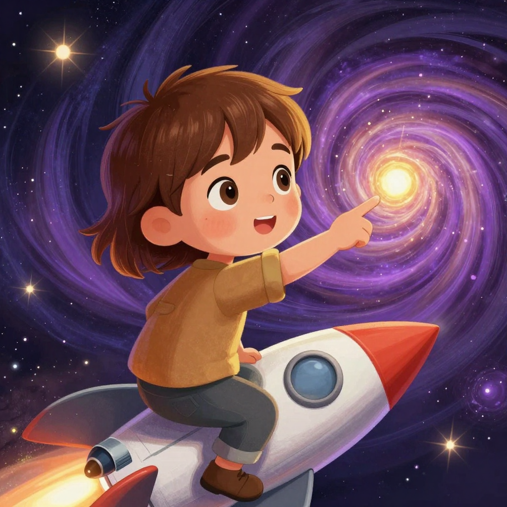 Discover Quasar in this enchanting page from Erden's A-Z adventure. Erden glows with violet and gold as stars bloom like sparks beside him, pointing at the quasar’s swirling heart. Perfect for young readers ages 3-8.