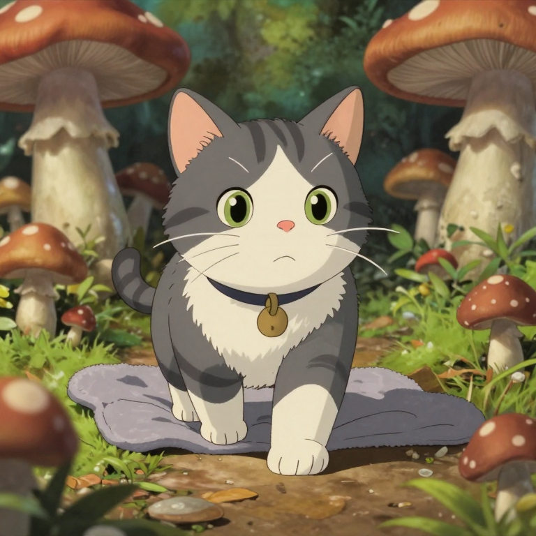 Discover Quick in this enchanting page from 🎪 Miji's A-Z adventure. Miji the brave munchkin cat wobbles through a dreamy mushroom garden, her tiny paws dancing with determination. Perfect for young readers ages 3-8.