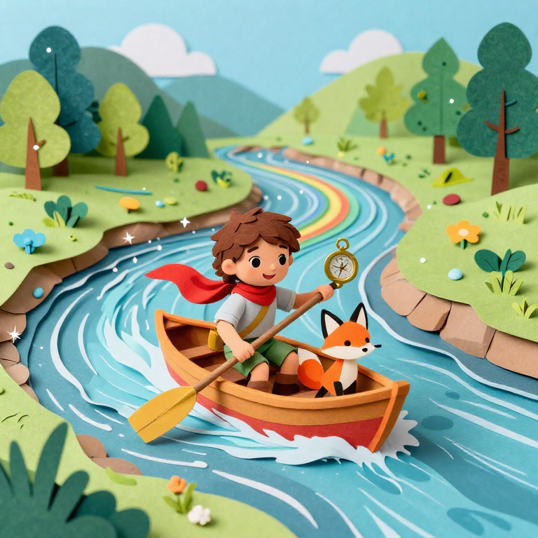 In this enchanting page from Astra & Comet (Paper Craft Edition)'s A-Z adventure, we discover Rainbow River. Astra and Comet paddle through a sparkling river of colors, with their boat bouncing over playful rapids. This illustration captures the magic of a brave girl and her loyal companion journey throu. Young readers will love exploring the letter R while learning about friendship. The brave mood of this page creates a perfect moment for parent-child reading time. Recommended for ages 3-8.