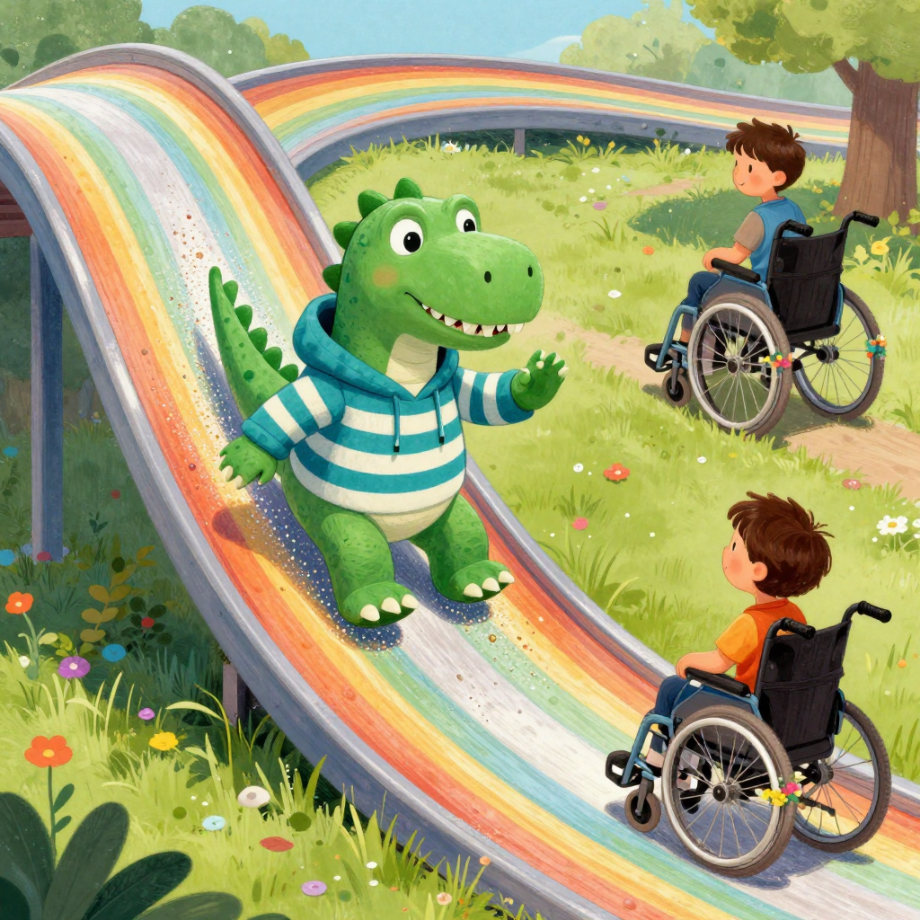 Discover Ramps in this enchanting page from Pipkin's A-Z adventure. Pipkin whooshes down a rainbow ramp, glitter trailing, waving to a friend with flower wheels. Perfect for young readers ages 3-8.