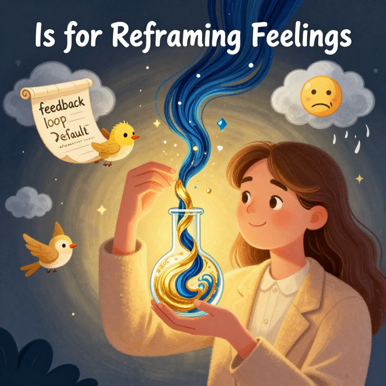 Discover Reframing Feelings in this enchanting page from BH Alchemy A-Z Guide's A-Z adventure. In the alchemist's hands, emotions dance as gold and blue swirl, transforming turmoil into messenger birds carrying whispers of wisdom. Perfect for young readers ages 3-8.