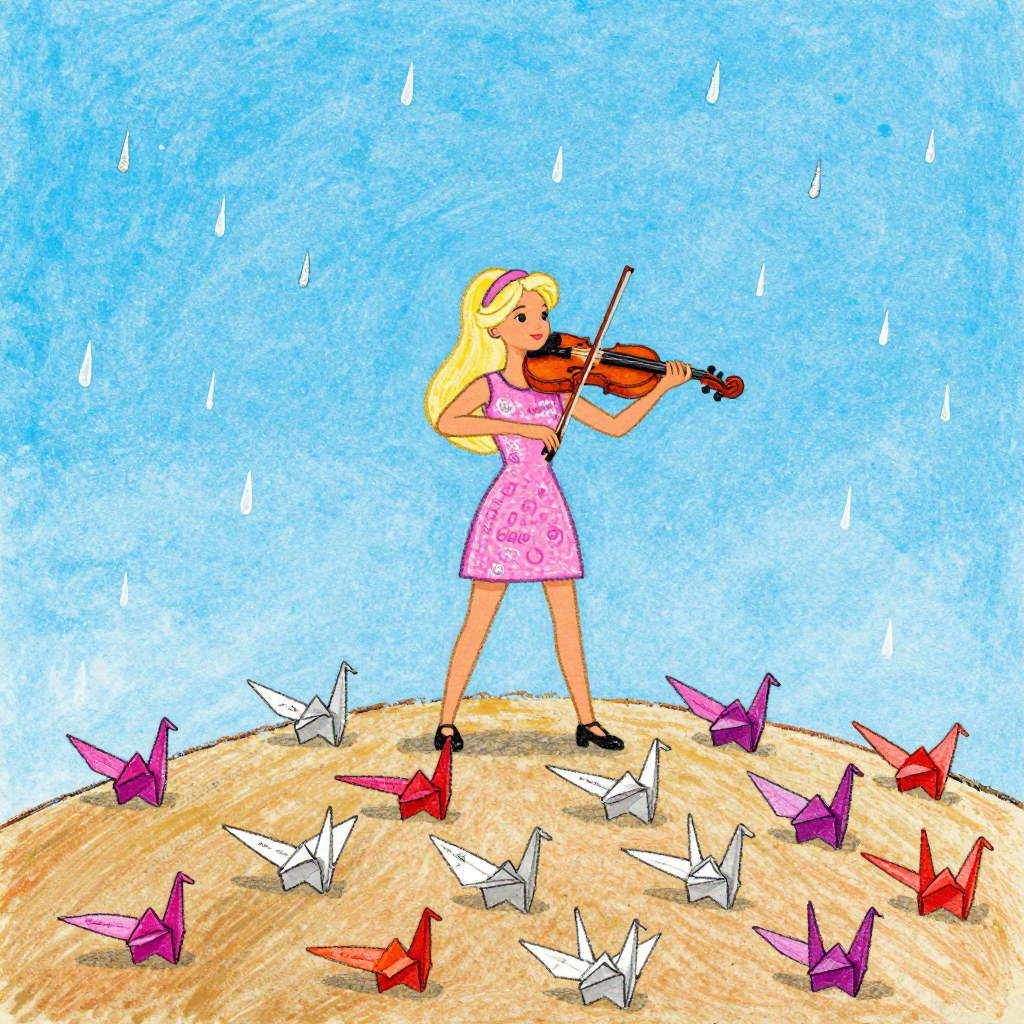 Discover Requiem in this enchanting page from Barbie's A-Z adventure. Barbie stands tall as paper cranes float away, each with a name, while glittery rain dances just out of reach. Perfect for young readers ages 3-8.