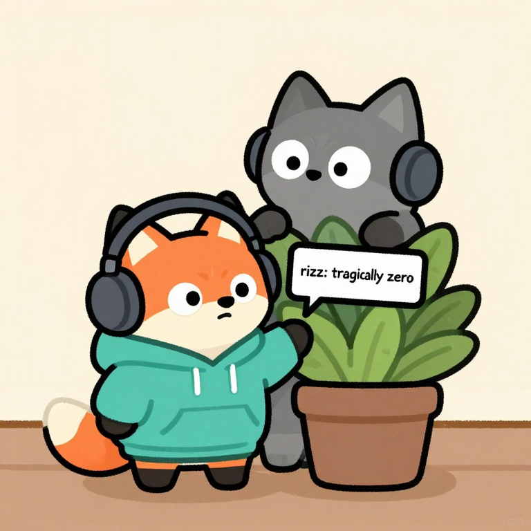 Discover Rizz in this enchanting page from Jax's A-Z adventure. Jax the fox tries to charm a plant with his big headphones—still, the plant just yawns. Perfect for young readers ages 3-8.