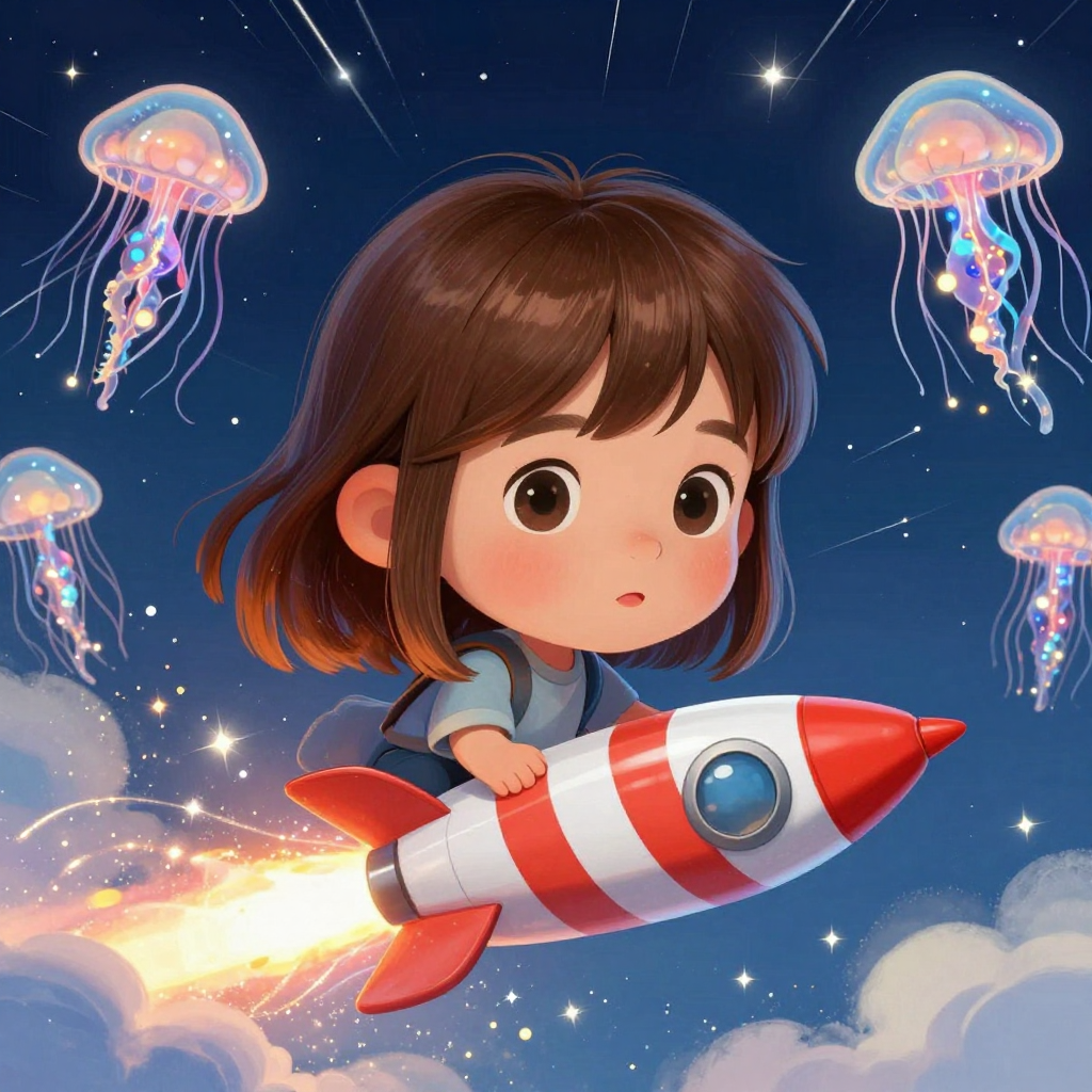 Discover Rocket in this enchanting page from Erden's A-Z adventure. Tiny Erden peeks from his candy-cane rocket, chasing glowing jellyfish through starry glitter skies. Perfect for young readers ages 3-8.