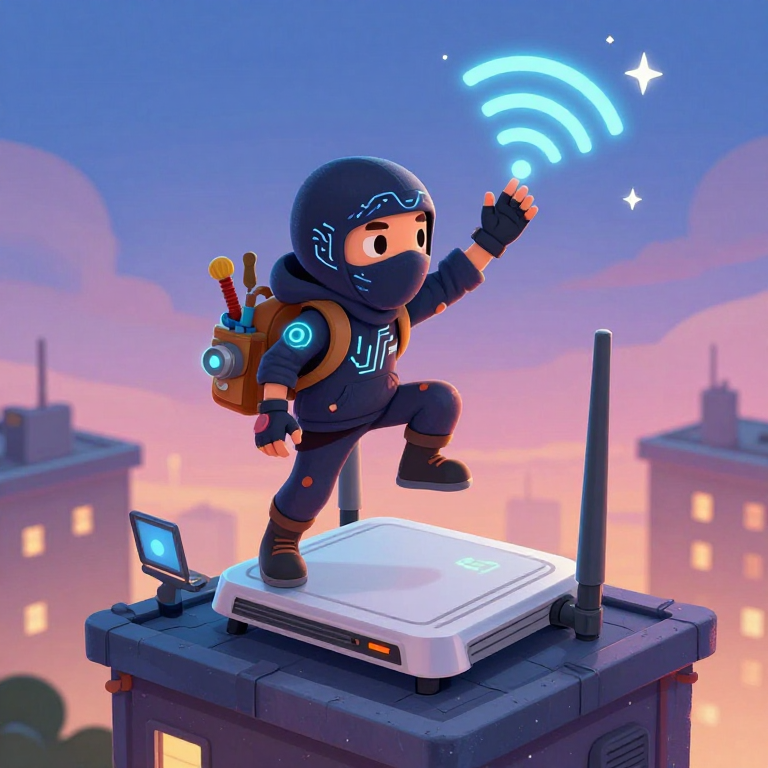 Discover Router Rooftop in this enchanting page from Mark the Ninja Acrobat Engineer's A-Z adventure. Mark the ninja engineer dances on a humming router roof, spinning antennas as Wi-Fi fireworks burst in rainbow spirals. Perfect for young readers ages 3-8.