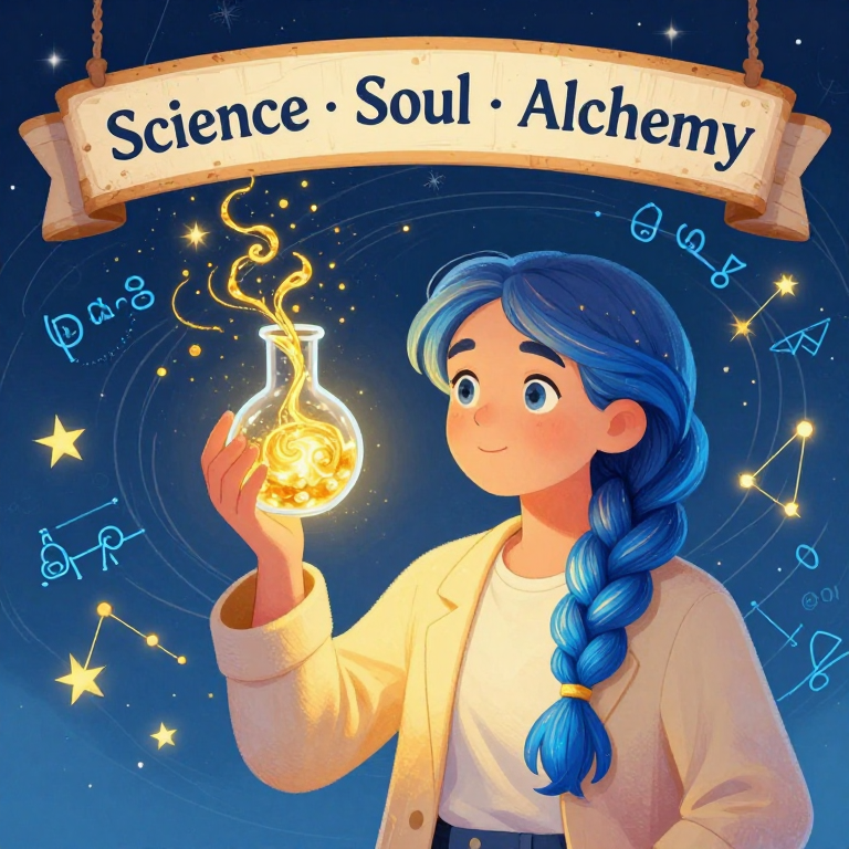 Discover Science & Soul in this enchanting page from BH Alchemy A-Z Guide's A-Z adventure. A dance of gold and blue, where science's logic embraces soul's mystique in a swirling embrace. Perfect for young readers ages 3-8.