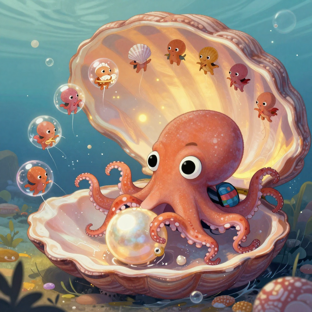 Discover Seashell in this enchanting page from Bubbles's A-Z adventure. Bubbles polishes a glowing pearl while six tentacles chime seashells in golden light. Perfect for young readers ages 3-8.