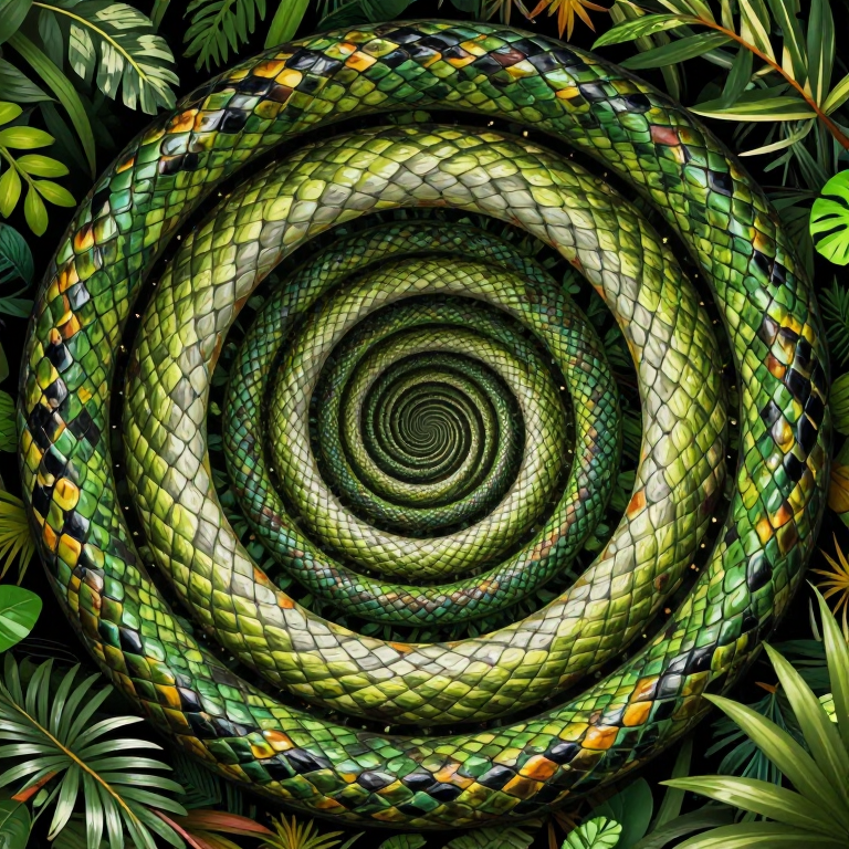 Discover Serpentine Spiral in this enchanting page from The Impossible Alphabet's A-Z adventure. The vibrant snake scales dance in a spiral trick, making your eyes see magic! Perfect for young readers ages 3-8.