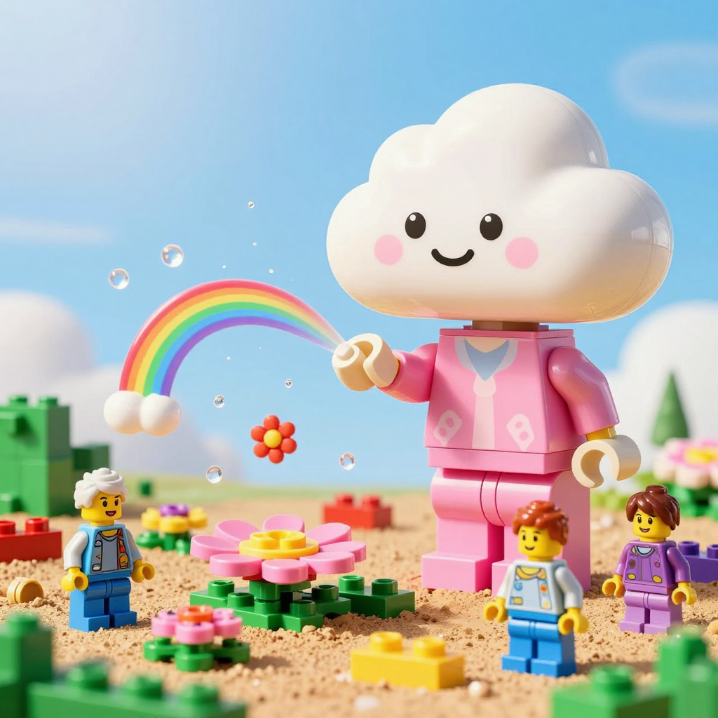 Discover Shower in this enchanting page from Sunny's A-Z adventure. Sunny the cloud sprinkles rainbow mist over dancing LEGO friends in a sunny, sparkly garden. Perfect for young readers ages 3-8.