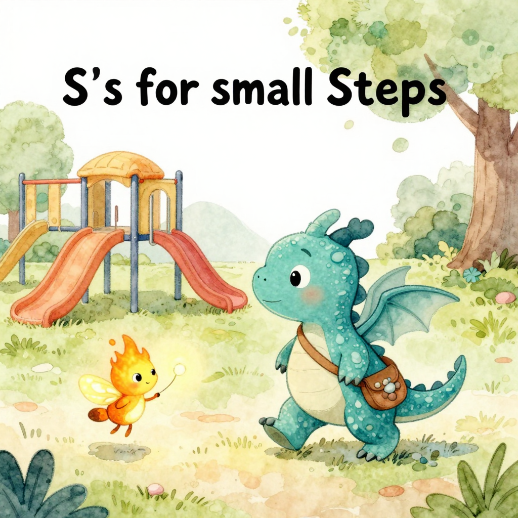 Discover Small Steps in this enchanting page from Milo the Worry Dragon's A-Z adventure. Milo takes a tiny step, firefly glowing beside him, as the playground glows in pastel dreams. Perfect for young readers ages 3-8.