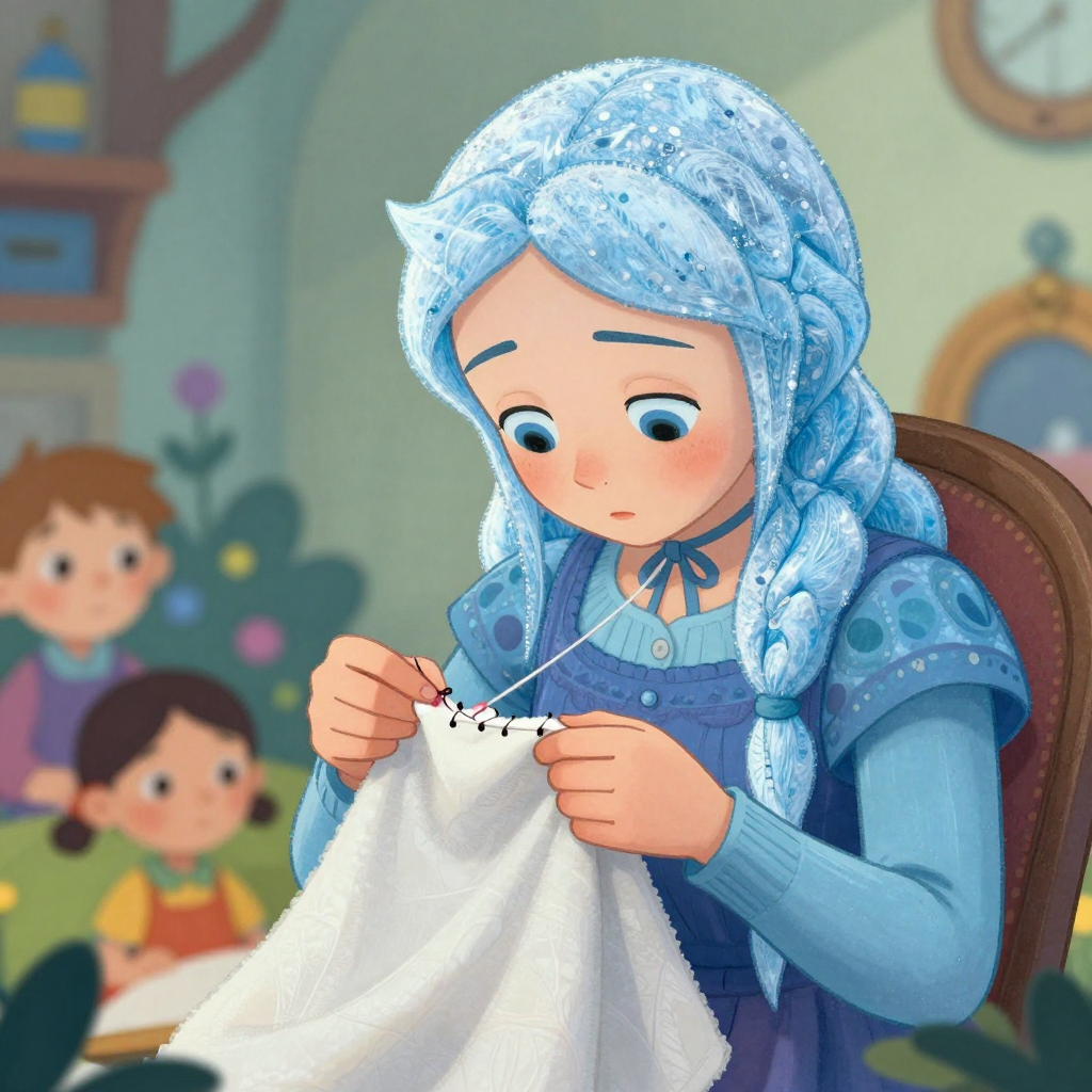 Discover Thimble in this enchanting page from Emeline's A-Z adventure. Emeline sews silence with thread of forgotten promises, her thimble glinting like frozen sighs. Perfect for young readers ages 3-8.