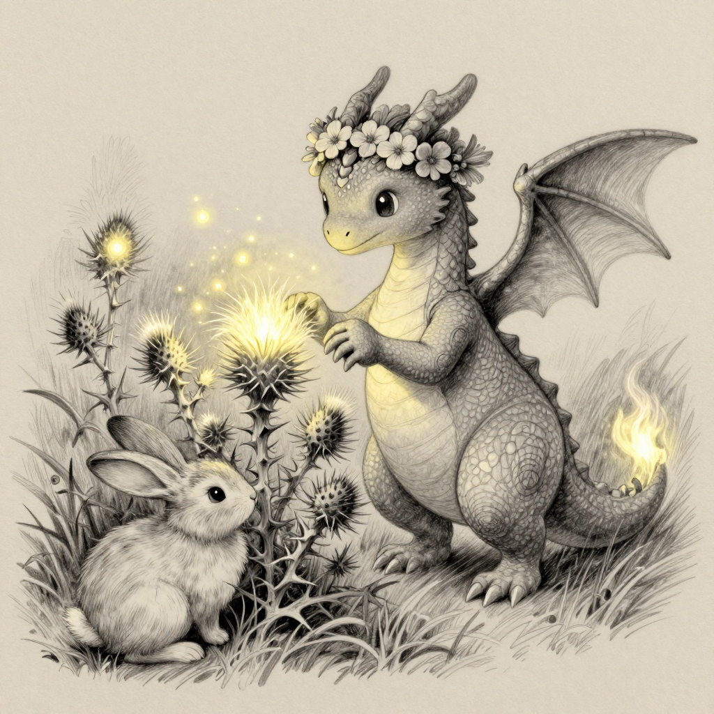 Discover Thistle in this enchanting page from Ember's A-Z adventure. Ember’s gentle flames turned thistle spines to glowing plumes as fireflies danced above their quiet nuzzle. Perfect for young readers ages 3-8.